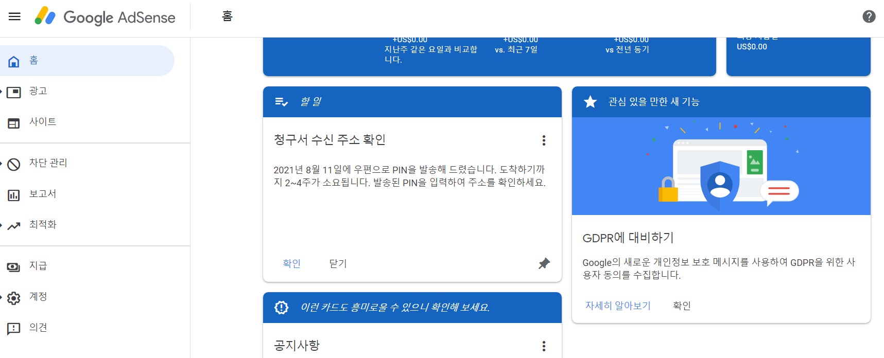 애드센스 홈페이지 가서 제 계정정보를 봤더니 PIN코드를 입력하라는 메시지가 계속 나오더라구요. 그리고 PIN코드가 우편으로 도착하기까지 2~4주까지 소요될 수 있다는 메시지가 나옵니다. 코로나로 인해 늦어질 수 있다는 양해 메시지도 있구요. 이게 무슨 소리인가 했습니다...